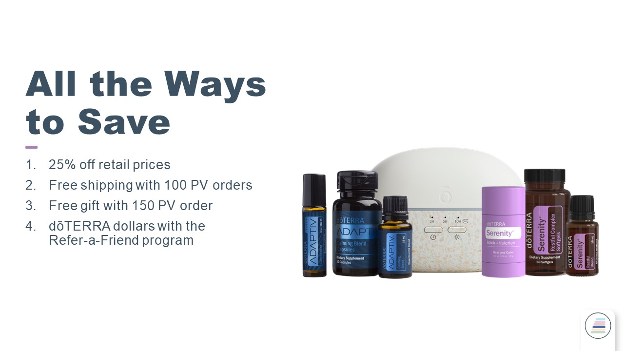 Would you like me to show you how to sign up and receive your first year of membership for free? Membership gives you 25% off every purchase! There are some other perks you’ll want to consider: •Free shipping on any order over 100 PV •A free Pebble™ Diffuser (valued at $33 retail) as a gift with a new membership account and initial 150 PV order Once your account is set up, I’ll show you how you can earn dōTERRA® dollars anytime your friends sign up using your referral link. The Refer-a-Friend program is the simplest way to receive dōTERRA dollars, which can be used to pay for anything on doterra.com.